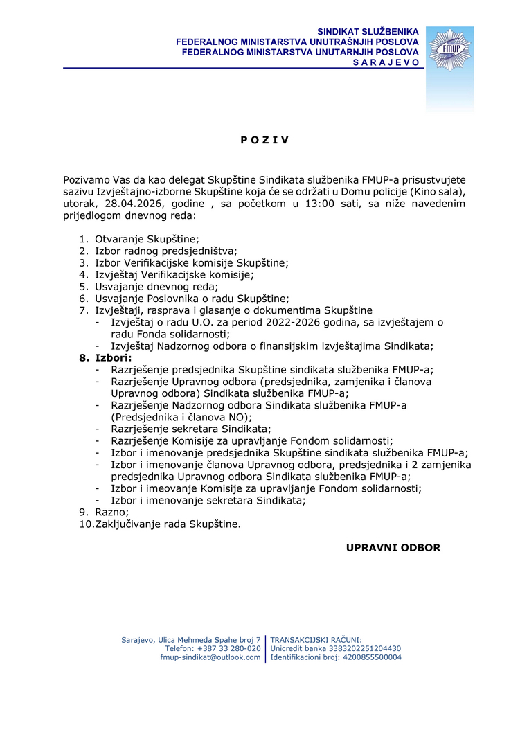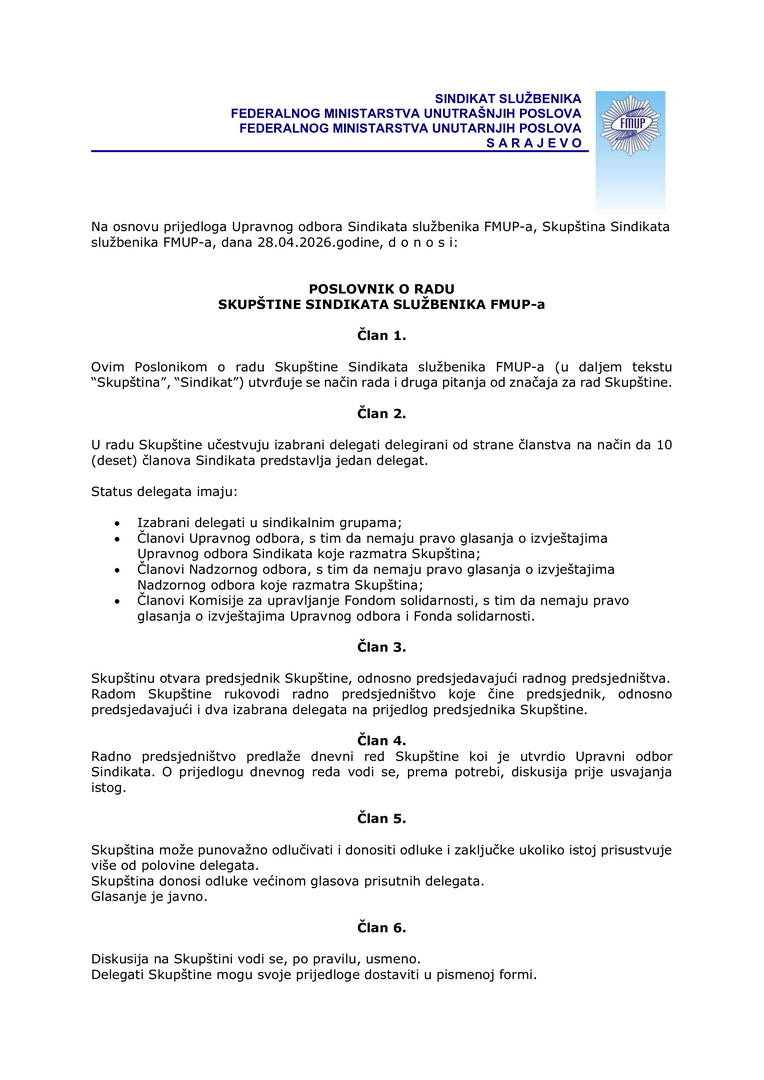 Za rad i odlučivanje Skupštine potreban je kvorum od 24 delegata, tj. nadpolovična većina s obzirom da Sindikat službenika broji 468 članova.